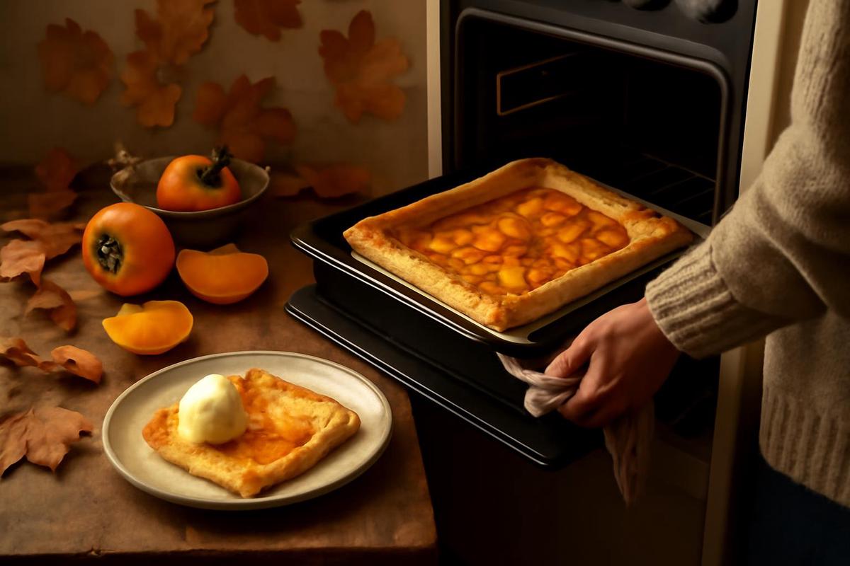 Se cubre el hojaldre con rodajas de caqui y se hornea, aplicando glaseado a mitad de cocción.