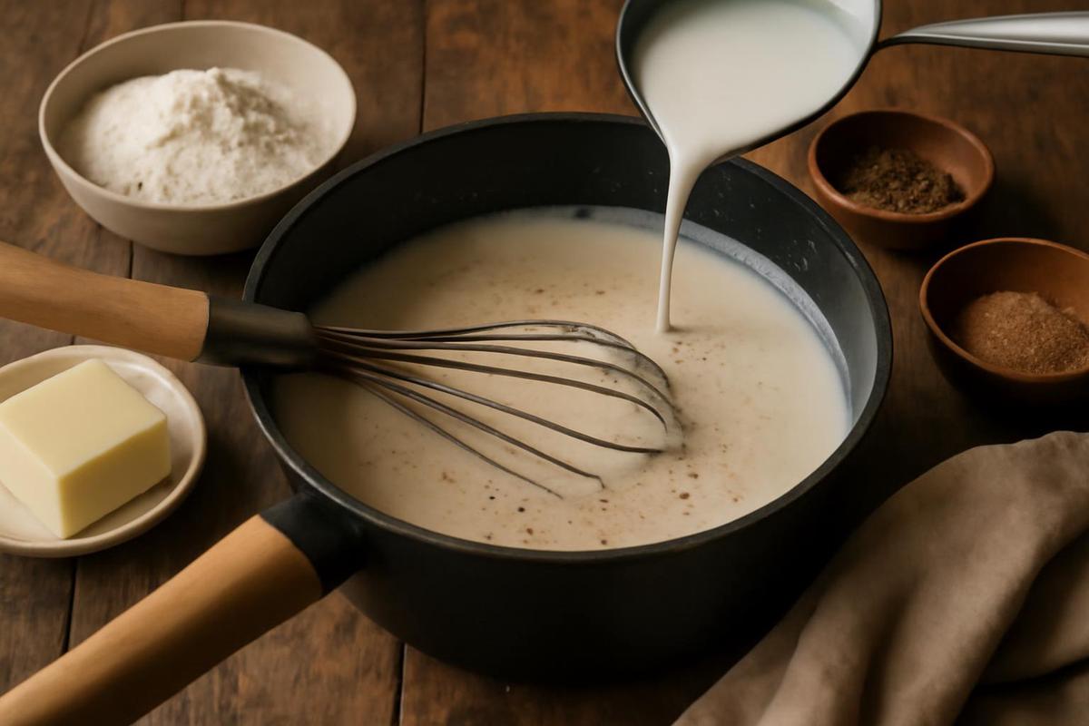 Poco a poco, se vertió la leche caliente sobre el roux, mezclando continuamente con un batidor para evitar la formación de grumos. Se continuó añadiendo la leche hasta que la mezcla se volvió suave y espesa.