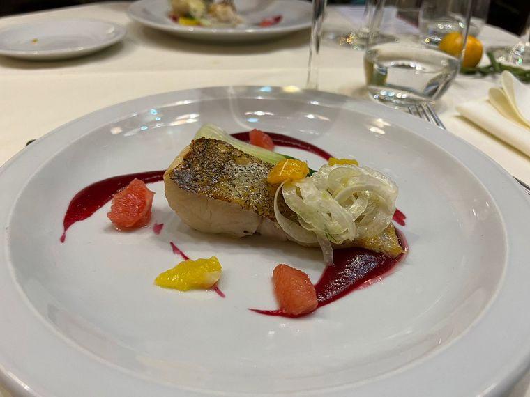 Como primer plato principal hubo una merluza negra con pack choi, hinojo y cítricos maridado con un Matías Riccitelli Viñedos de Montaña Chardonnay. Como segundo una morcilla con trigo, cenizas y apio que fue maridada con un Riccitelli Vistalba Bonarda.