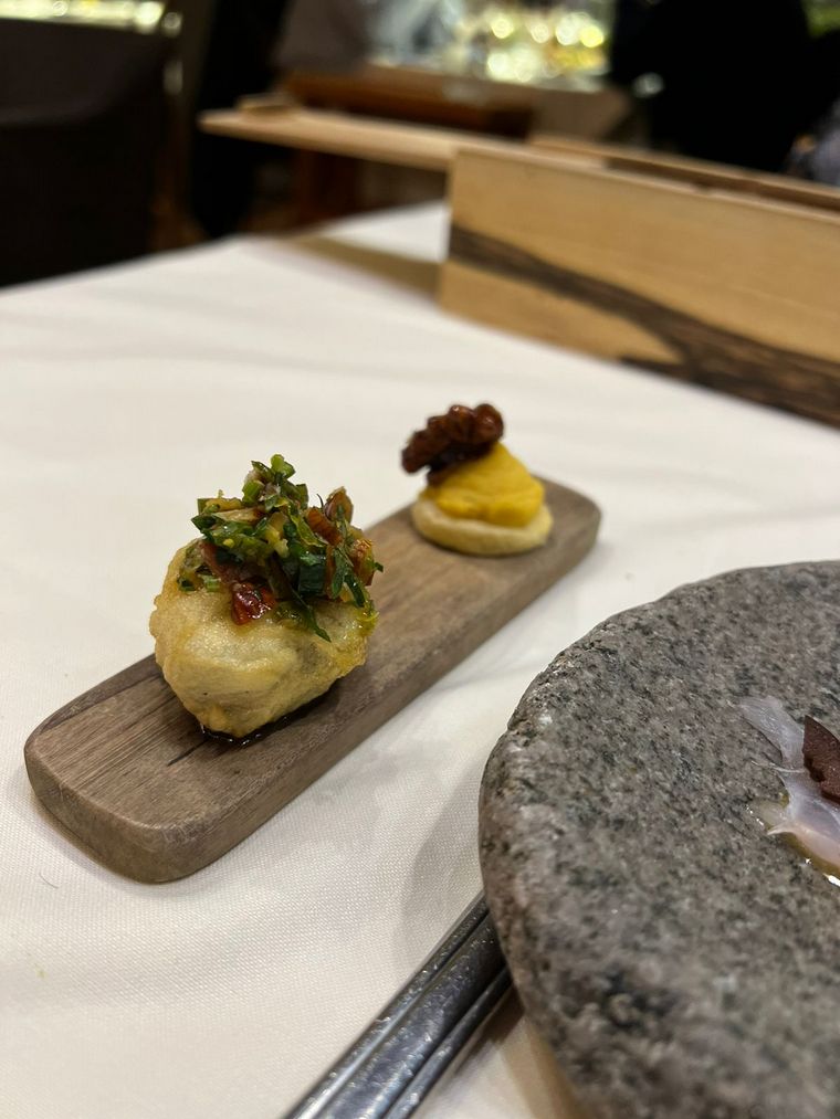 Los comensales fueron recibidos con una serie de snacks que incluyeron: tempura de seso y gremolatta, hydrocotile con ricota, brócoli con vinagreta de naranjas y almendras; crudo de pescado con aceitunas y alcaparras, tartar de cordero con mostaza y cubanitos con hongos, un clásico de la cocina de Sibaris. Estos entrantes estuvieron acompañados con un vino Riccitelli Gualtallary Chardonnay.
