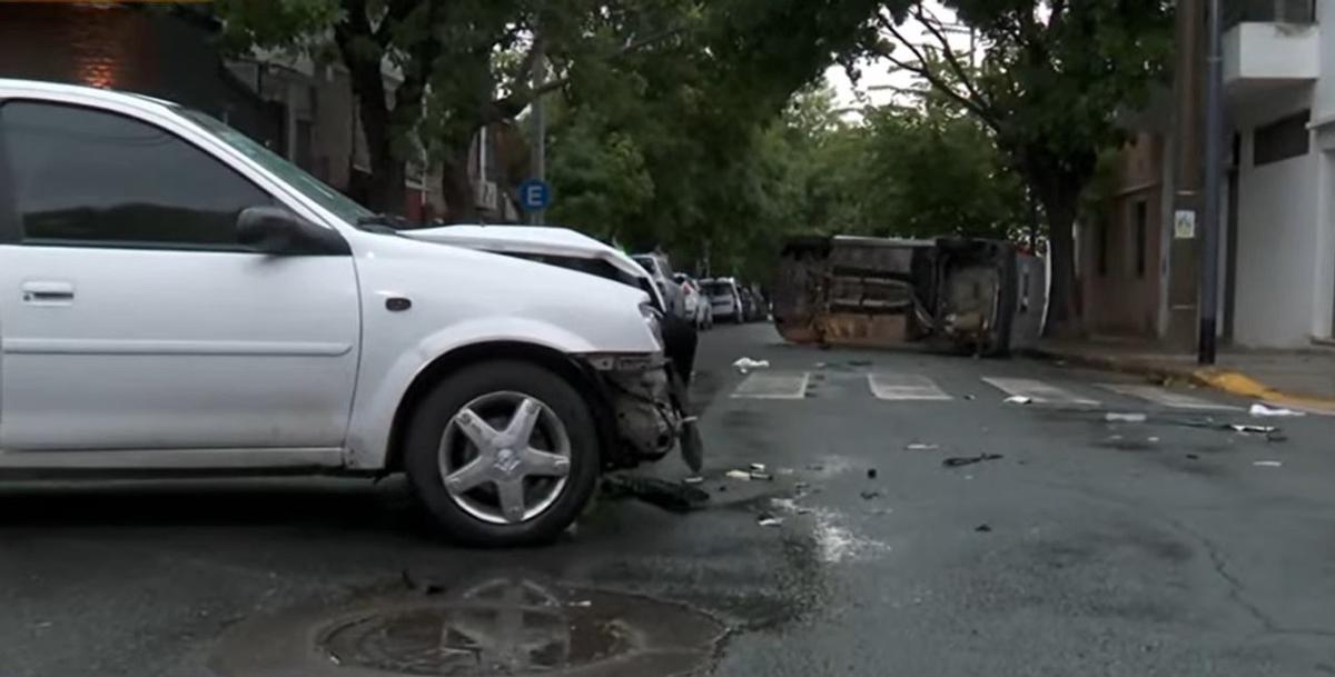 El incidente tuvo lugar en la intersección de Ramallo y Conde, donde dos vehículos colisionaron violentamente, lo que provocó que uno de ellos volcara sobre la calzada y el otro resultara con su parte delantera completamente destruida.