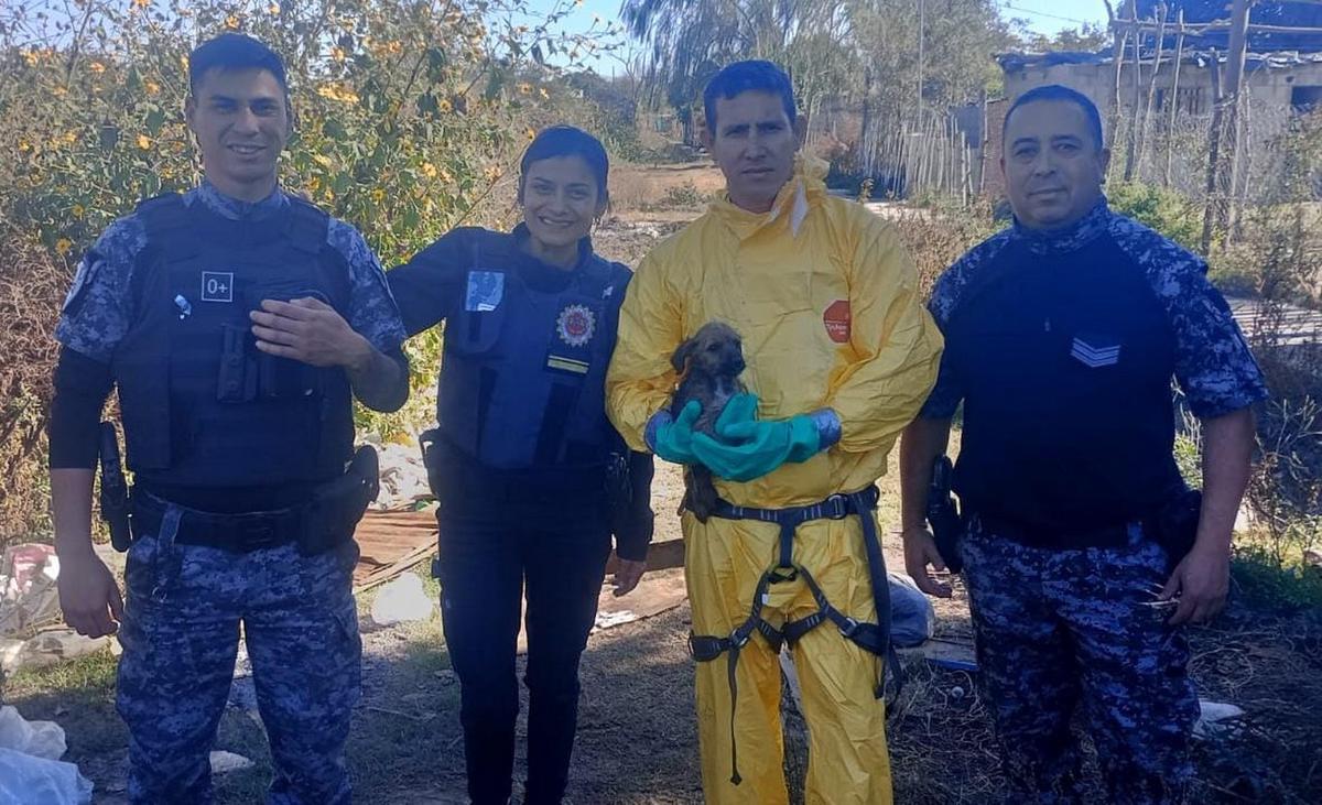 Un cachorro mestizo, que había caído en una alcantarilla de tres metros de profundidad llena de líquidos cloacales, fue salvado gracias a la rápida intervención de los agentes.