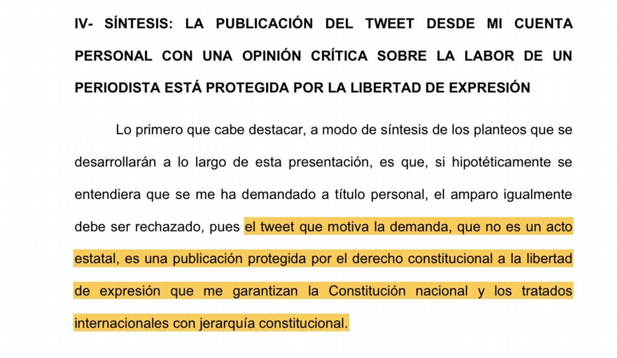 “(El reposteo) Fue realizado desde mi cuenta personal (@JMilei) y no implicó una decisión administrativa, normativa o acto estatal alguno, ni implicó uso de fondos públicos, sino que constituyó una acción privada que contiene la expresión crítica sobre la labor y agenda subyacente de un periodista públicamente conocido”, sostuvo el mandatario en el texto.