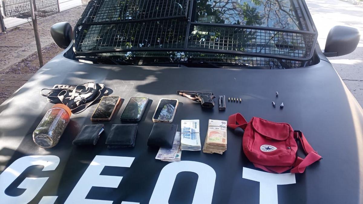 Dentro del vehículo, la Policía halló un frasco con aparentemente marihuana, una pistola calibre 22 con cinco cartuchos, además de tres teléfonos celulares y una suma de dinero en efectivo cuya procedencia es materia de investigación.