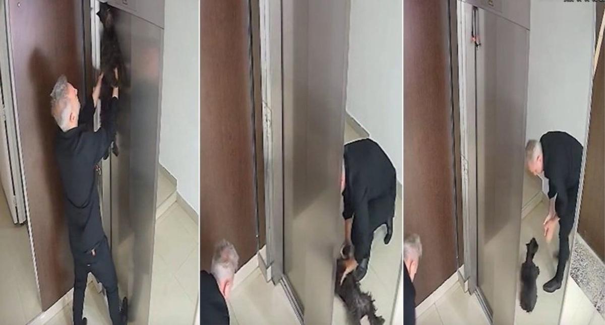 El video que se volvió viral, muestra a una mujer que ingresa al elevador, lleva una correa en la mano, pero el animal no ingresa al cubículo que se cierra y lo termina por estrangular, cuando en pocos segundos llegó el artista.