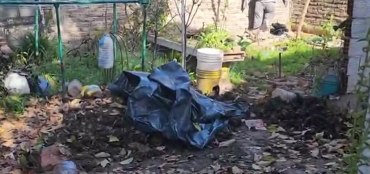 En las imágenes se observa el patio en estado de abandono con hojas, plantas crecidas, bolsas de residuos, muñecos colgados y juguetes de niños como, por ejemplo, un camión de plástico.