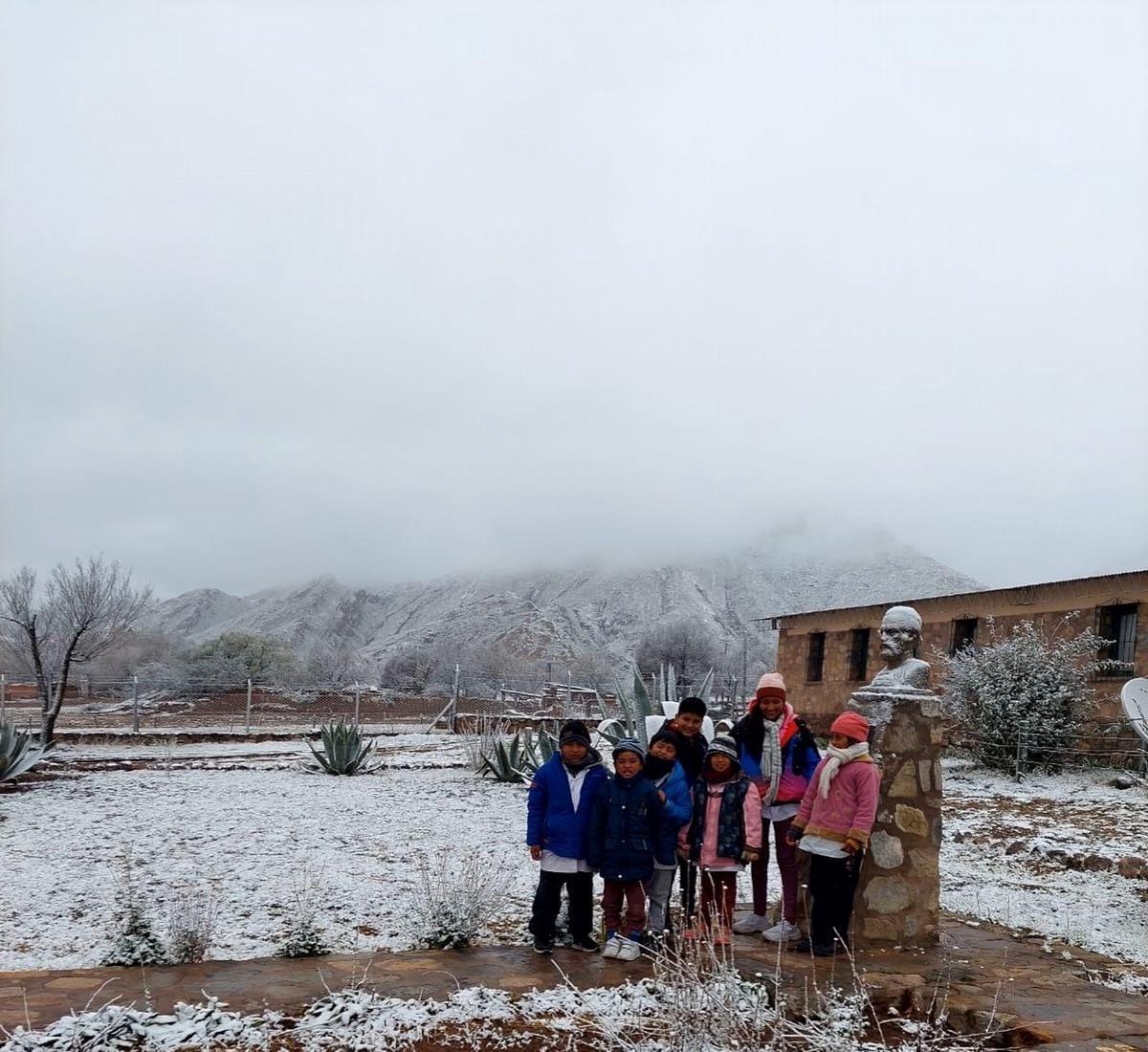 Una nevada histórica sorprende a los niños de una escuelita en Isonza, Salta, donde la comunidad se alegra por la belleza del invierno en las montañas. La temperatura en el paraje alcanzó cuatro grados bajo cero y la máxima no llegó a dos grados.
