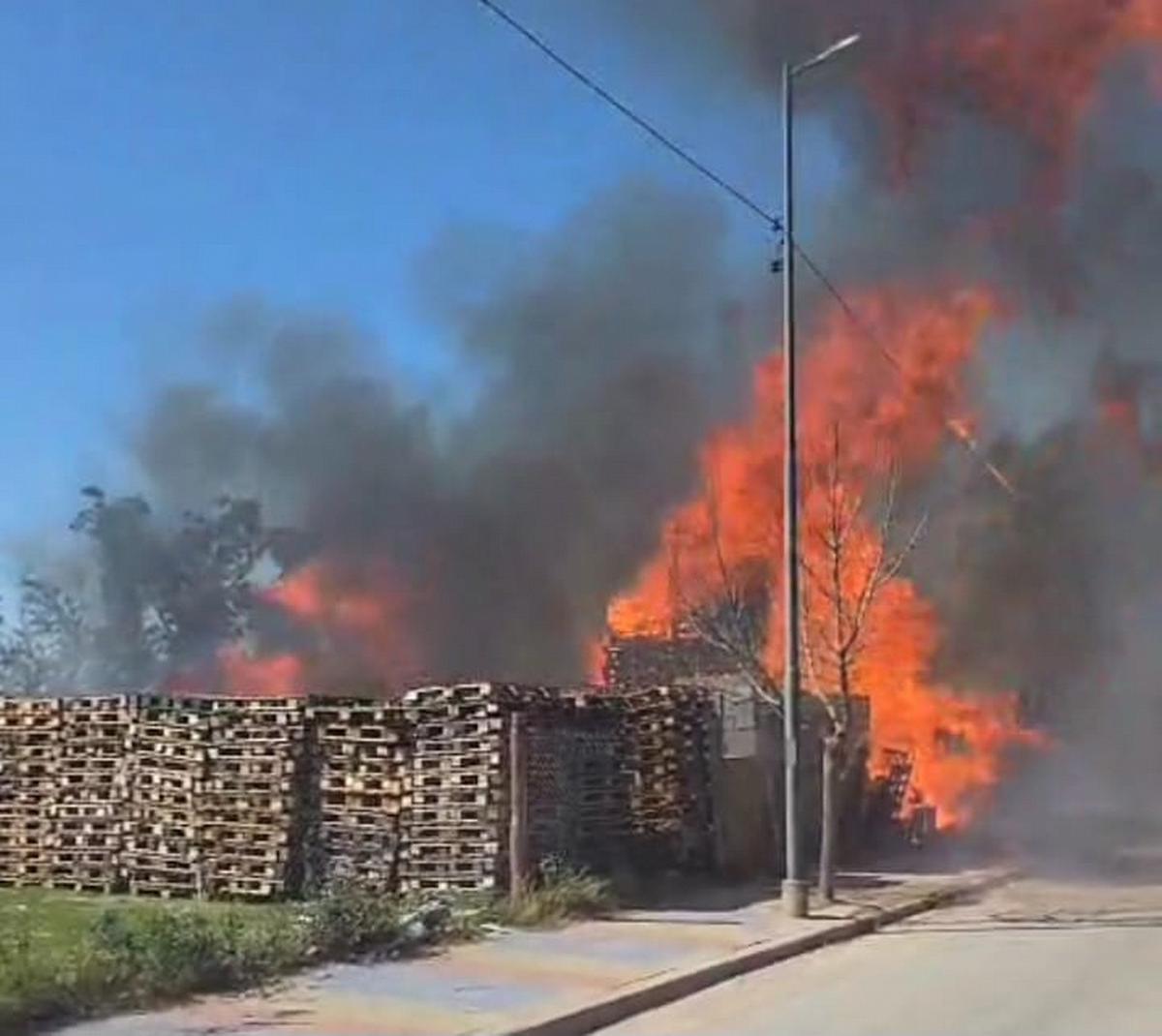 Un fuego iniciado en malezas se propagó a un depósito de tarimas