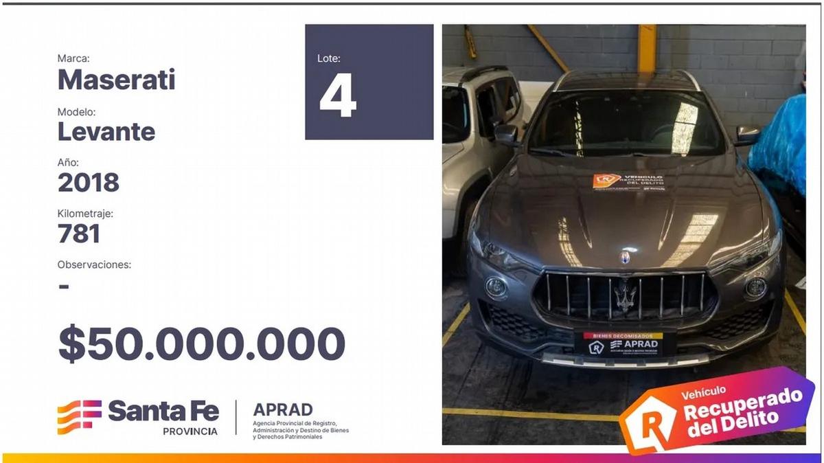 La ciudad de Rosario se prepara para una subasta pública de bienes decomisados al narcotráfico, entre los que se destaca una Maserati Levante, modelo 2018, con apenas 780 kilómetros recorridos. Este vehículo tendrá un precio base de 50 millones de pesos.