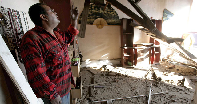 Un hombre muestra c�mo se desplom� el techo de su casa en Concepci�n.