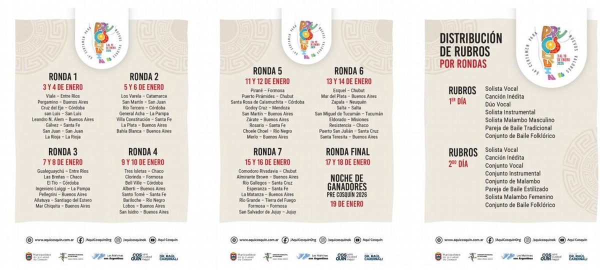 Las finales del Pre Cosquín 2026 se desarrollarán el sábado 17 y domingo 18 de enero, tras lo cual se conocerán las y los ganadores de cada rubro, que formarán parte de la programación oficial del Festival Nacional de Folklore.