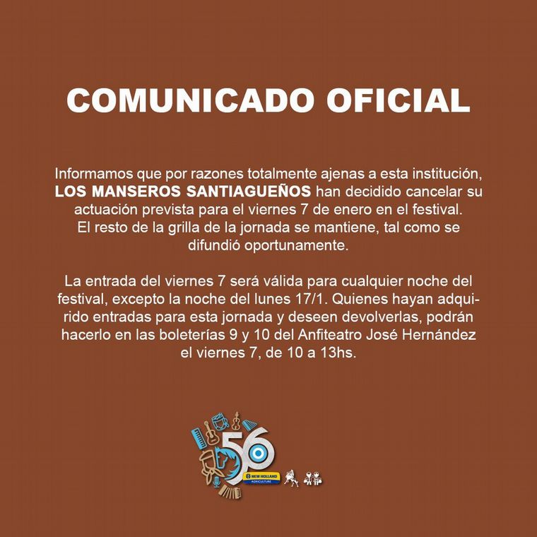 La organización había informado la situación previamente: “Informamos que por razones totalmente ajenas a esta institución, Los Manseros Santiagueños han decidido cancelar su actuación prevista para el viernes 7 de enero en el festival. El resto de la grilla de la jornada se mantiene tal como se difundió previamente”.