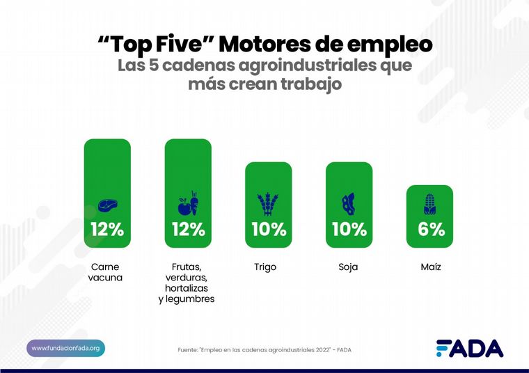• Top 5 cadenas que más empleo generan: 12% Frutas, verduras, hortalizas y legumbres, 12% carne vacuna, 10% soja, 10% trigo, 6% maíz.