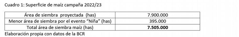 Cultivo de maíz: En este caso lo que calculamos una menor siembra del cultivo (5 %) a la estimada en su momento por la Bolsa de comercio de Rosario en agosto de 2022 (Cuadro 1). Hay que recordar que los informes de avance de siembra en noviembre de 2022 para maíz temprano, fueron realmente malos, ya que solo se había implantado un 30 % del mismo.