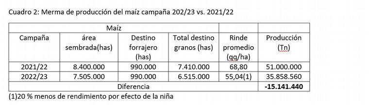 Con esta área que probablemente se siembre de maíz (con una tendencia hacia la baja) y considerando que el evento “Niña” produciría una merma de rendimiento de un 20 % (Cuadro 2), podemos calcular las toneladas a producir de este grano para el año 2023, lo que nos resulta una merma de producción de 15 millones de toneladas.