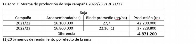 Cultivo de soja: En este caso y por la mayor ventana de siembra que tiene la soja, vamos a considerar que se va a sembrar la superficie estimada por la Bolsa de Comercio de Rosario en agosto de 2022 (Cuadro 3). Si por el efecto del evento niña la producción cayera un 20 % (en muchas zonas va haber una diferencia importante entre soja implantada y cosechada), la producción en el año 2023 sería de prácticamente 5 millones de toneladas.