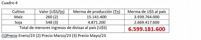 Menores ingreso de dólares por menores producción de maíz y soja en el año 2023: En base a los números de producción tanto para el maíz como para la soja, en el año 2023 (Cuadro 4), el país tendrá una merma de ingreso de dólares por el efecto del evento climático “Niña” de 6.600 millones de dólares.