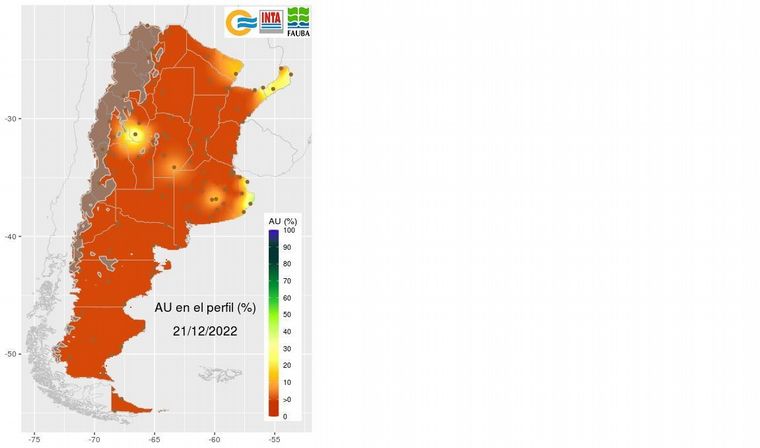 a) Agua Útil del perfil (AU) al 21/12/2022, donde observamos déficit prácticamente en todas las zonas agrícolas del país. Esto trae como consecuencia que por más que llueva a partir de ahora, solo tendremos aguas en capa arable, ya que la recuperación de agua útil en la napa es casi imposible para el primer cuatrimestre del 2023, descartando la posibilidad de la influencia de napa para los cultivos.