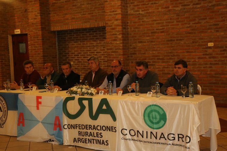 Las máximas autoridades a nivel nacional y provincial de las entidades gremiales del campo se reunieron anoche, en el Salón de Usos Múltiples de la Rural local.