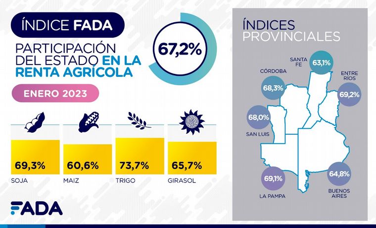 Mientras el índice FADA nacional es de 67,2%, Córdoba registra un 68,3%, Buenos Aires 64,8%, Santa Fe 63,1%, La Pampa 69,1%, Entre Ríos 69,2% y San Luis 68%.