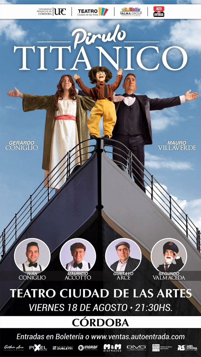 También está Segundo Valmaceda quien es el capitán del barco. Pirulo Titánico tiene una duración de 90 minutos, se desarrolla en 3 escenas diferentes, con ambientaciones acordes a la trama. Acompañada por 3 videos grabados en exteriores que son proyectados en pantalla led y que le dan línea de continuidad a cada escena.