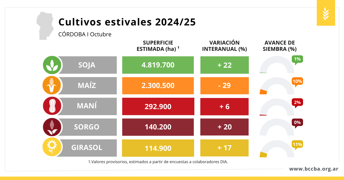 Con las lluvias caídas en el mes de octubre y la mejora en el contenido de agua útil en los suelos, se dio inicio a la siembra de soja y maní. El sorgo, por otro lado, aún no había comenzado a sembrarse a mediados de octubre.