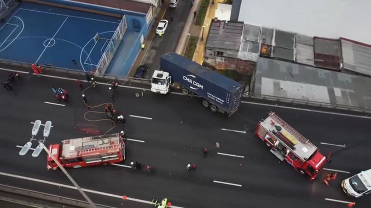 Un camión quedó colgado de la Autopista 25 de Mayo tras sufrir un fuerte choque contra el guardarraíl. El hecho ocurrió esta madrugada a la altura de San Telmo, mano a Liniers y hubo corte total en la calle Perú, para evitar la posible caída del camión, así como también sobre la autopista.