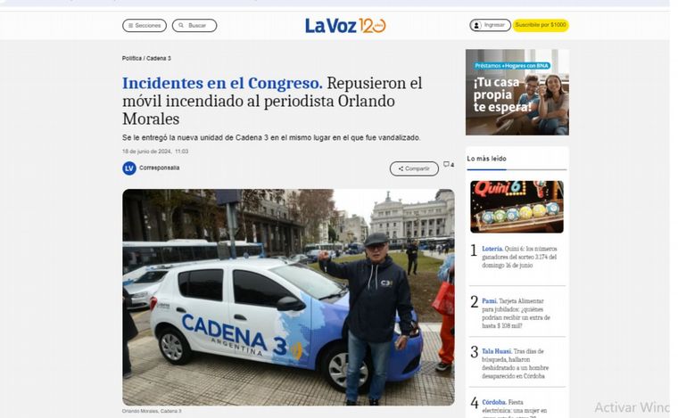 El diario La Voz del Interior resaltó el momento en que se entregó el nuevo vehículo en el lugar donde fue incendiado el móvil. El tradicional períódico de la provincia de Córdoba tituló: Incidentes en el Congreso. Repusieron el móvil incendiado al periodista Orlando Morales