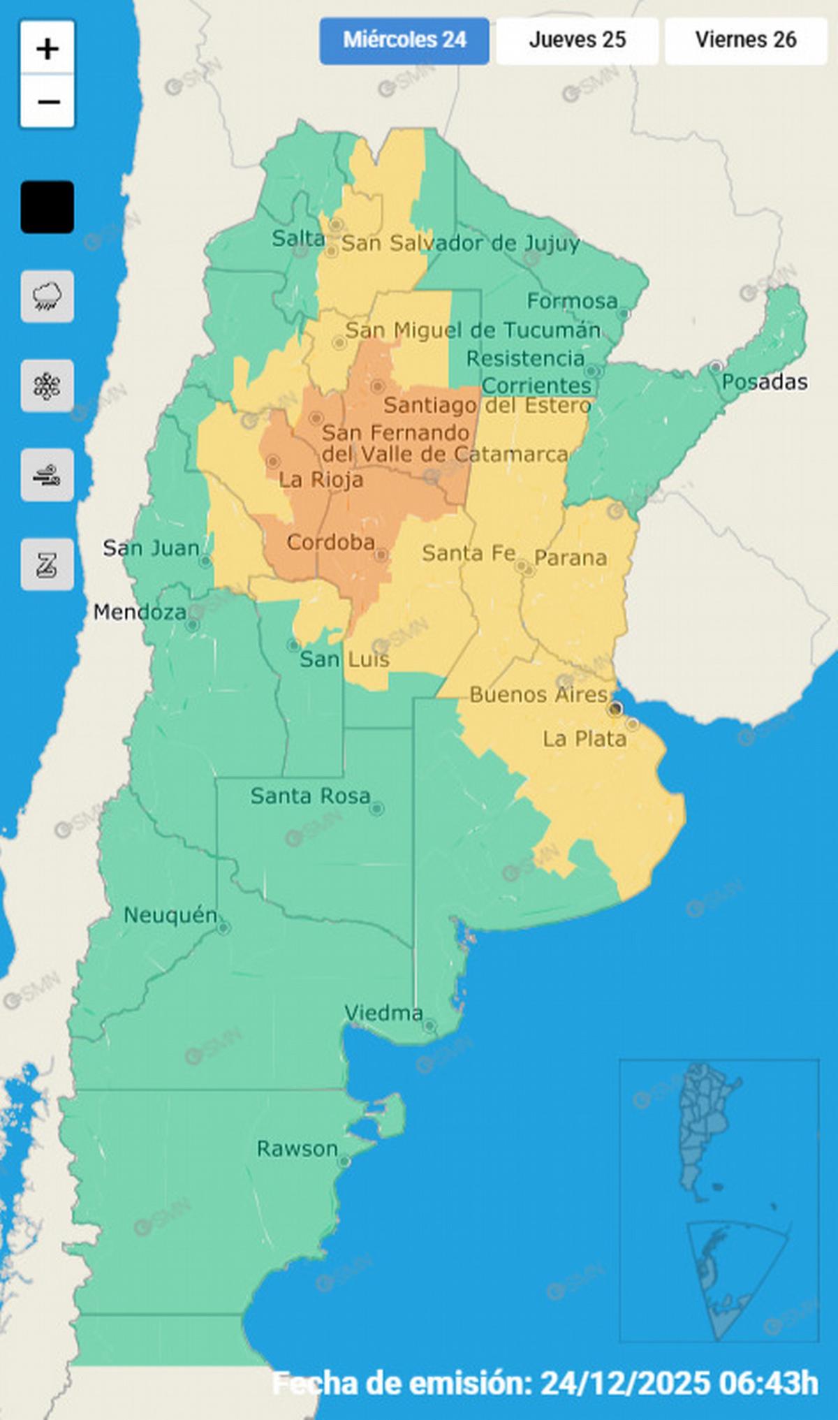 -Miércoles 24: tormentas fuertes. Mínima 20°C, máxima 35°C.