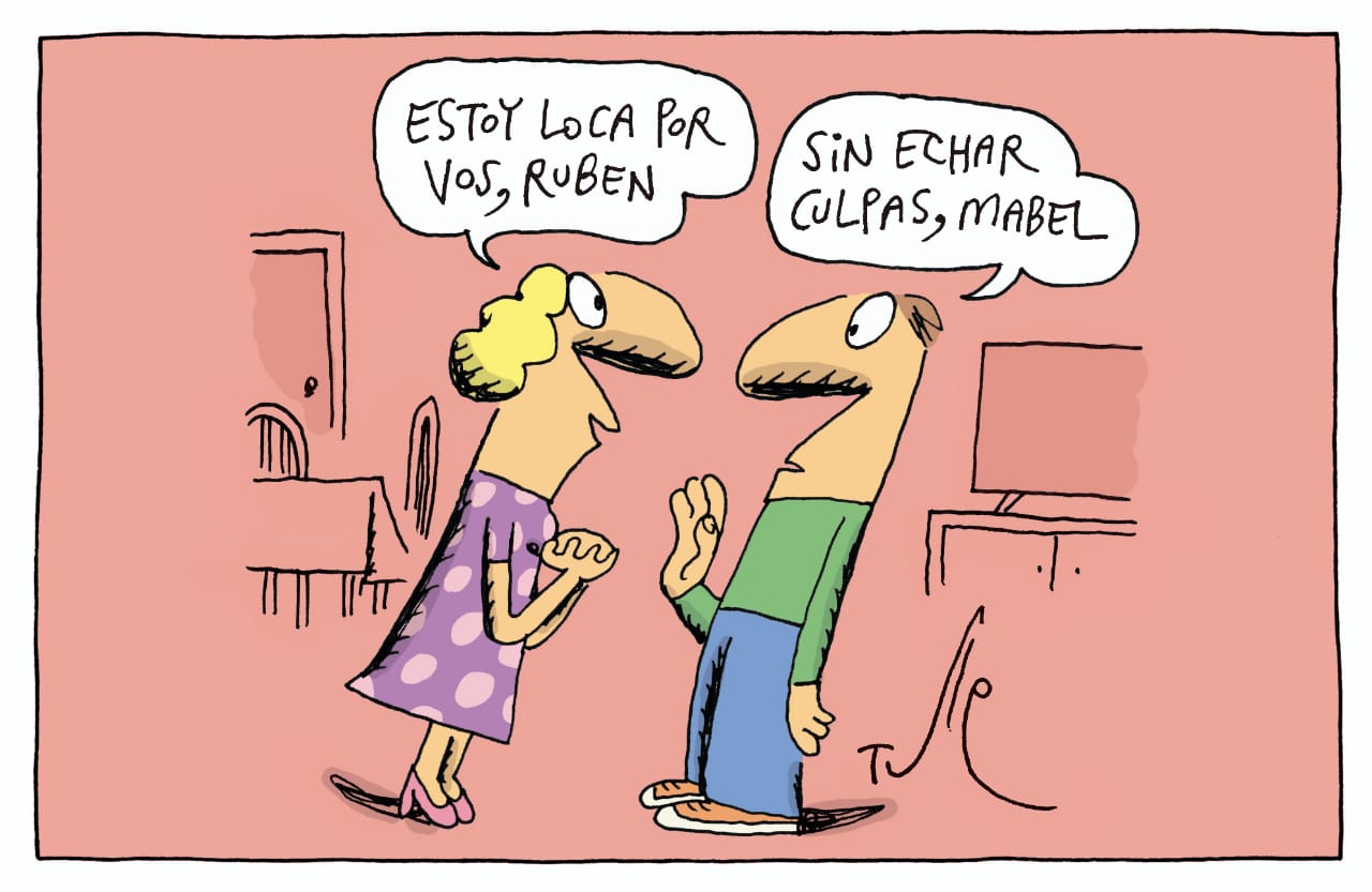 Rubén y Mabel son los clásicos personajes del humorista que aparecen que aparecen en “Tutelandia”, su espacio diario en La Nación y que representan con sus diálogos situaciones típicas de las relaciones en pareja, con mucho humor.