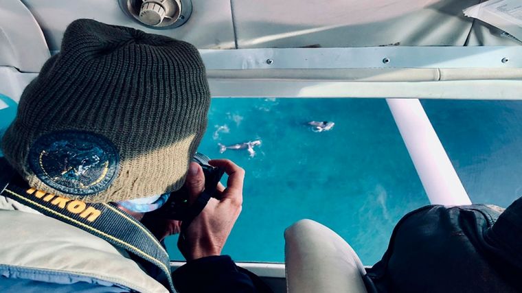 El especialista agregó que "en el sector de las playas 'El Doradillo' y 'Canteras' cercanas a Puerto Madryn había una línea casi continua de ballenas a lo largo de la playa con marea alta y al sobrevolar Puerto Pirámides observamos que la bahía estaba llena de ejemplares, mientras las lanchas de avistaje acompañaban a los animales con sol radiante y mar calmo".