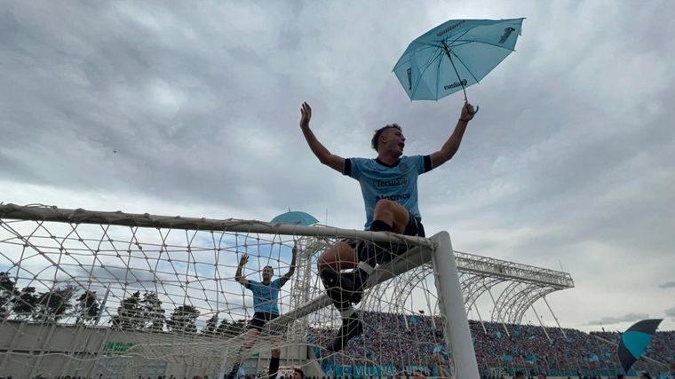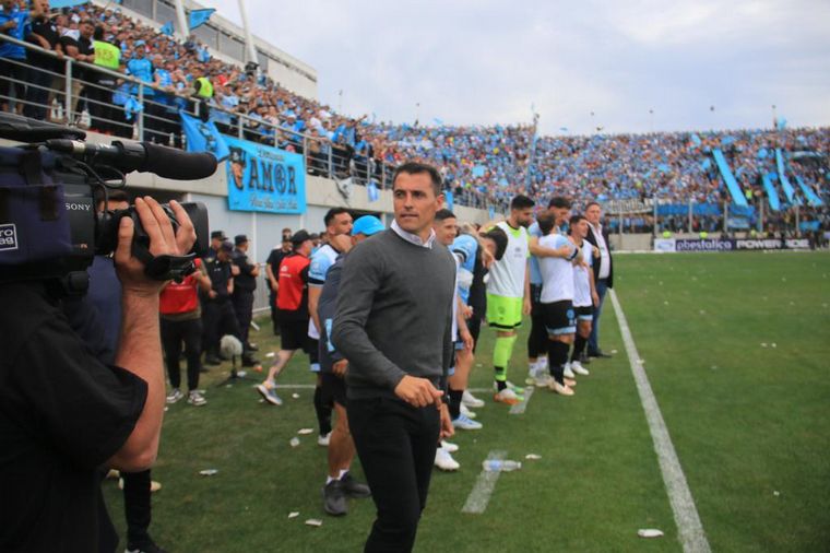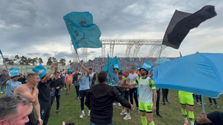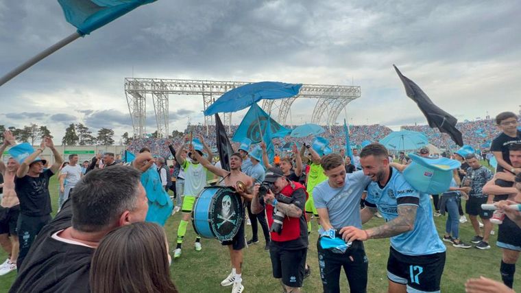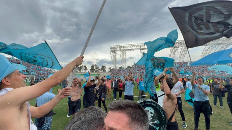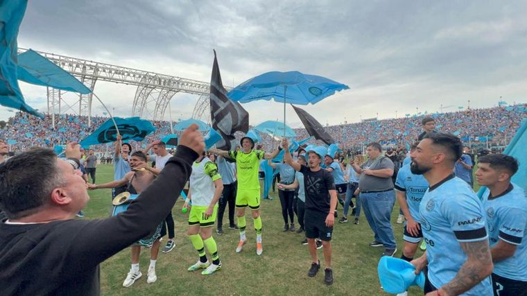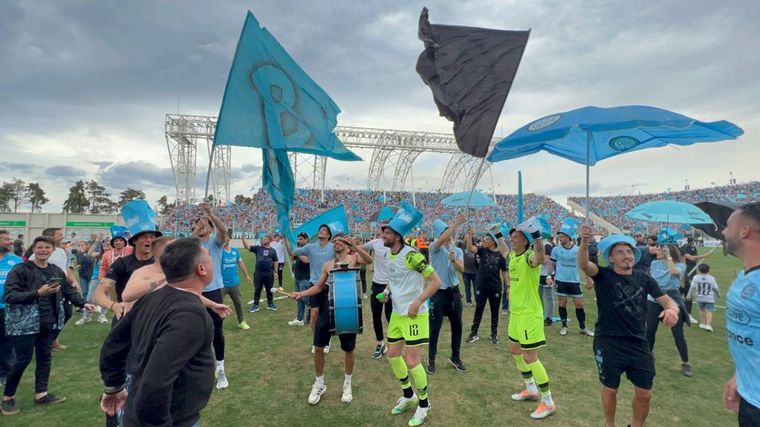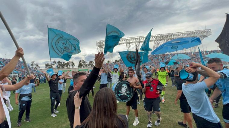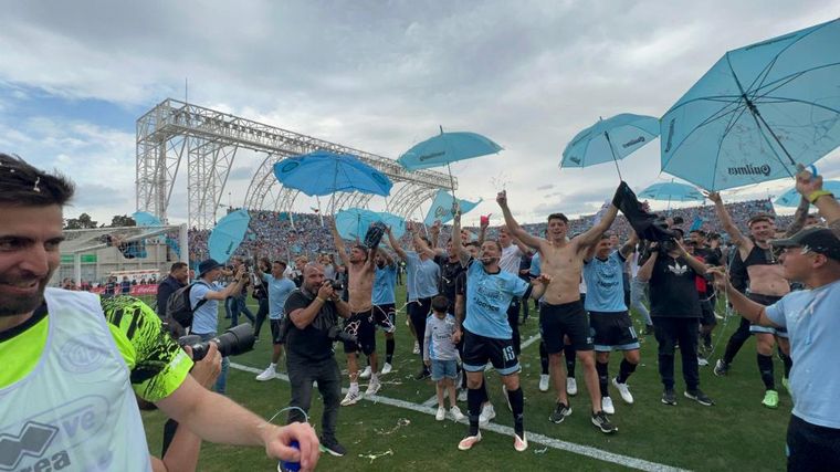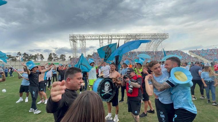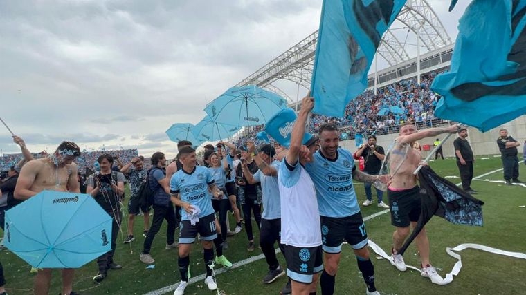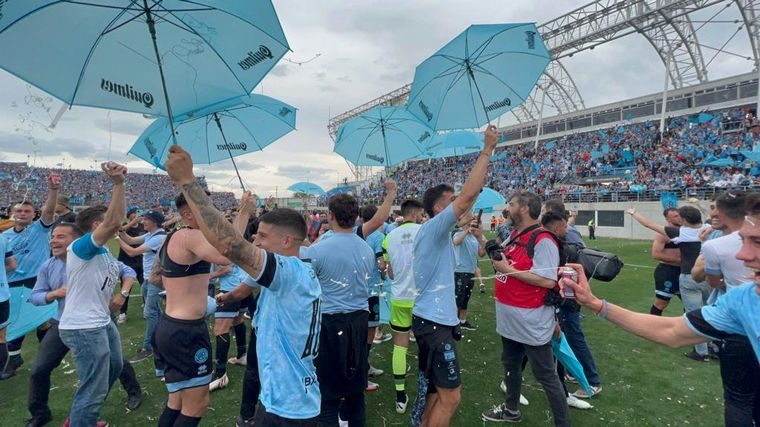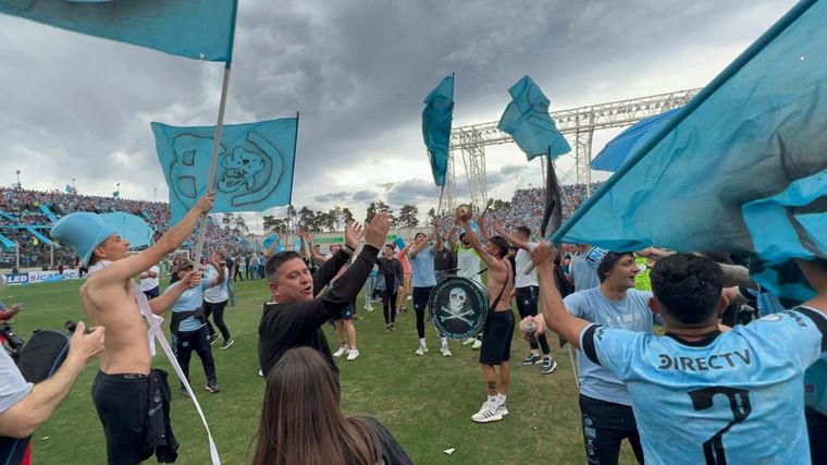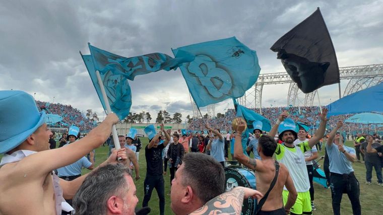 FOTO: Los festejos del plantel de Belgrano en la cancha de San Nicolás.