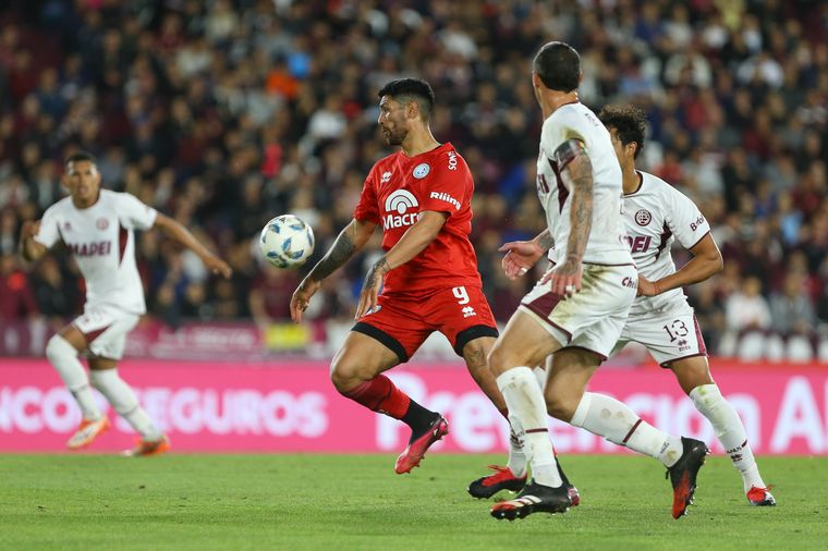 FOTO: Lucas Passerini se lleva la pelota entre los centrales "granates" (Foto: @Belgrano)