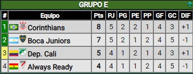 Ese jueves 26 de mayo entonces, simultáneamente desde las 21 jugará Boca en La Bombonera con Deportivo Cali mientras que Corinthians lo hará con Always Ready en San Pablo, por la sexta y última fecha del Grupo E.
