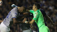 El defensor brasileño le pegó un cabezazo involuntario al arquero de Boca, Esteban Andrada, al ir a buscar un centro. El árbitro, Eber Aquino, acudió a la asistencia tecnológica y lo expulsó. Video