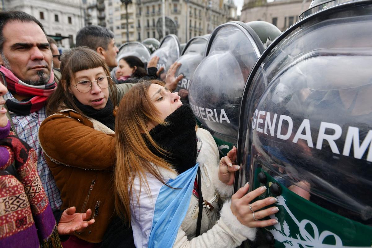Mientras los manifestantes continuaban con su protesta en la plaza, llegaron varios camiones de la Policía Federal y móviles de Gendarmería. En cuestión de minutos, la presencia de uniformados duplicó a la de los manifestantes, generando un clima de tensión.