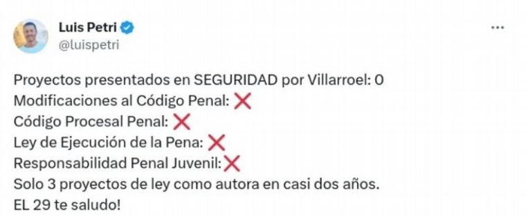 "Proyectos presentados en SEGURIDAD por Villaruel: 0. Solo 3 proyectos de ley como autora en casi dos años. El 29 te saludo!", expresó el postulante a través de su cuenta de X .