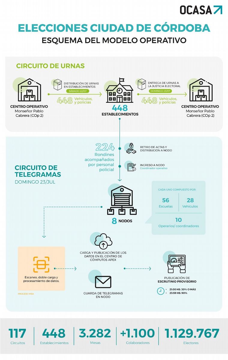 La empresa Ocasa, que tiene a su cargo el desarrollo del operativo electoral, publicó un esquema para ilustrar el operativo logístico para las elecciones a intendente que se llevarán a cabo este domingo en la ciudad de Córdoba.