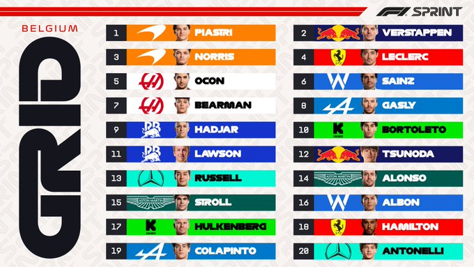 Oscar Piastri consiguió la pole position para el Sprint del Gran Premio de Bélgica de Fórmula 1 este fin de semana, superando a Max Verstappen por casi medio segundo, mientras que su compañero de equipo en McLaren, Lando Norris, solo pudo salvar el tercer lugar. Mientras, que el argentino Franco Colapinto no logró superar la primera fase clasificatoria y quedó en P19.
