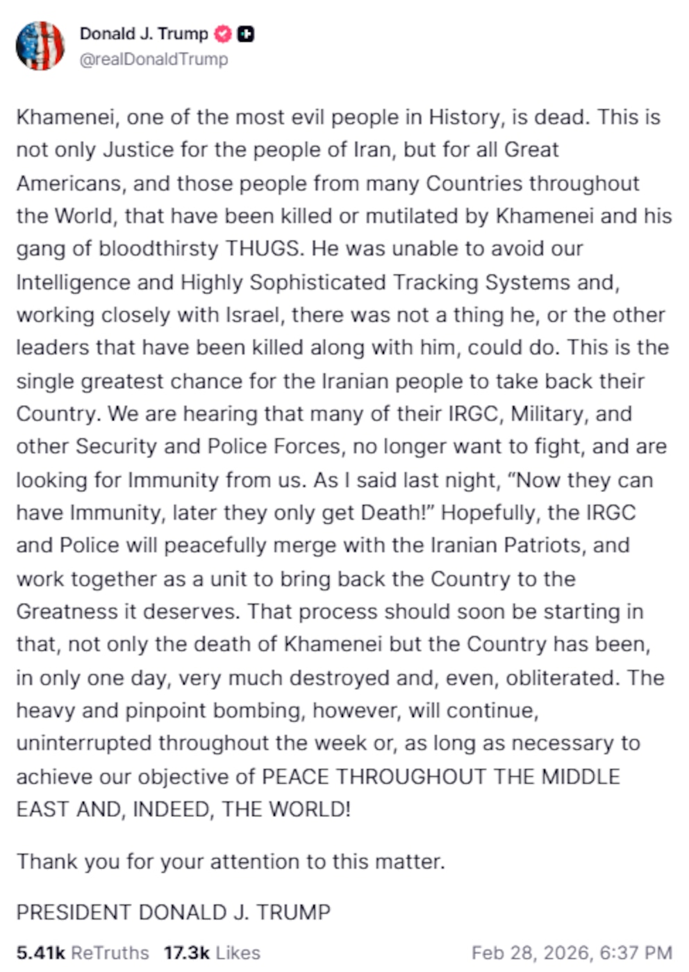 “Khamenei, una de las personas más malvadas de la Historia, está muerto”, escribió Trump en un mensaje en el que también sostuvo que la operación representa “justicia para el pueblo de Irán y para las víctimas en todo el mundo” atribuidas al régimen iraní.