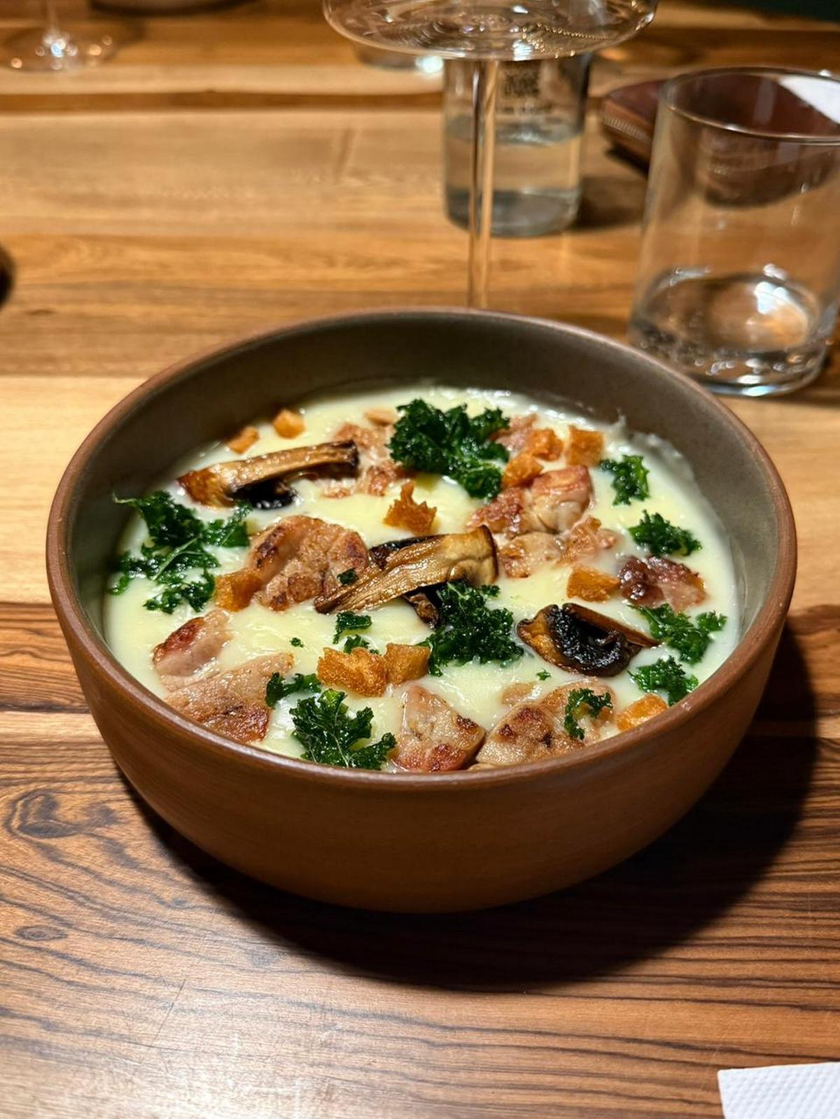 Uno de los platos más representativos de Bend es el cremoso de mollejas, acompañado por lima y limón sobre una base de papa y queso gouda, con champiñones salteados y kale crujiente. La propuesta combina técnica y producto sin perder accesibilidad. El cierre suele llegar con opciones dulces en formato pequeño, como los mini cakes rellenos de mousse de chocolate, pensados para extender la sobremesa.