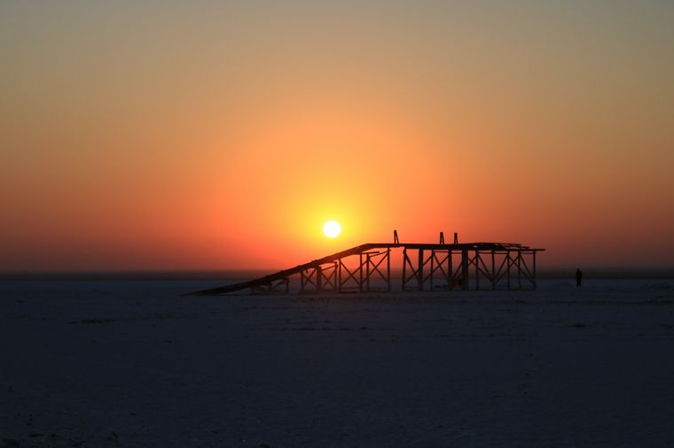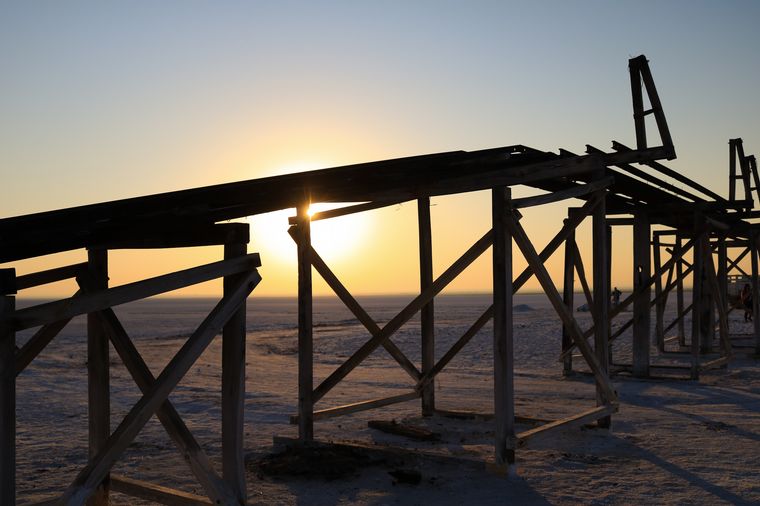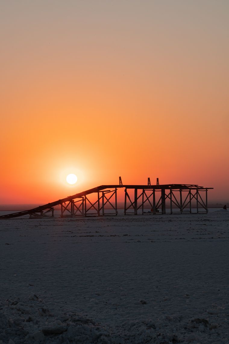 En este lugar, el sol sale del otro lado del salar, justo detrás de la única estructura que queda en pie de la vieja mina de extracción que funcionaba en el lugar.