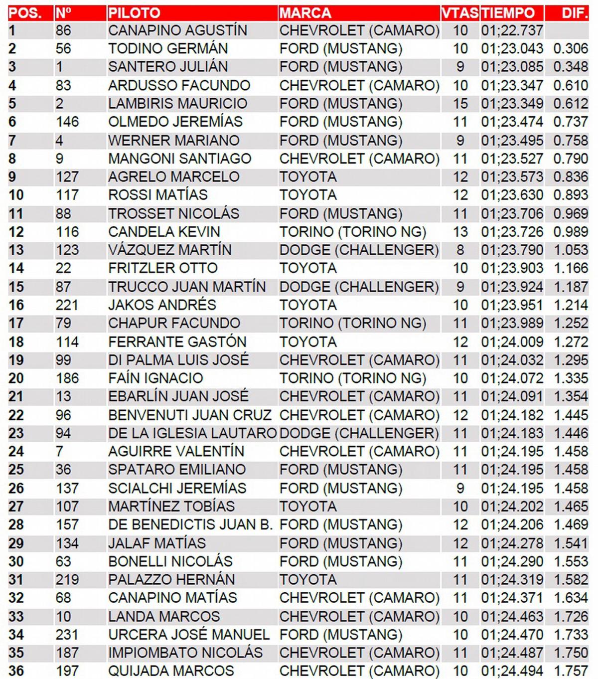 Canapino desde el primer grupo que salió a entrenar se puso al frente y su tiempo de 1.22.737s le bajó 0.9s al registro de la primera tanda de Agrelo cuando colocó neumáticos nuevos en el final de la tanda. El 'Titán', dejó atrás al 'Gaucho de Rivera' ypor 0.306, al campeón Santero +0.348s, a Ardusso +0.610s y a Lambiris +0.612.