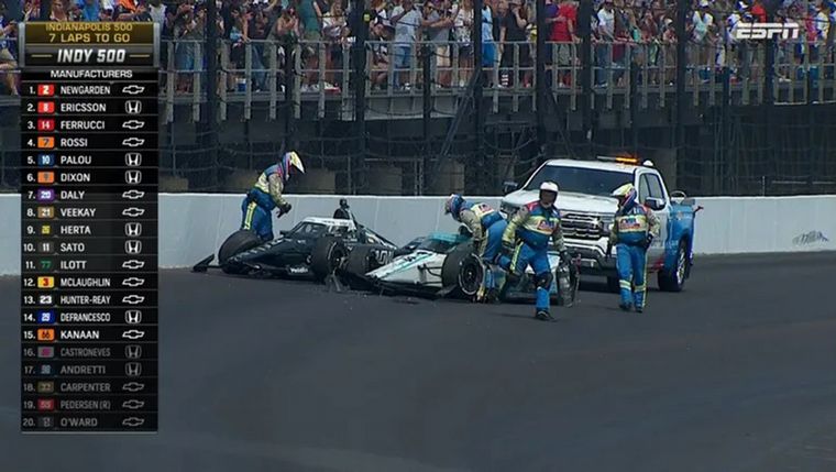 Agustín Canapino con el Dallara/Chevrolet #78 del "Juncos Hollinger Racing" estuvo a punto de completar las hist´ricas "500 Indy", pero a solo 7 vueltas del final cuando marchaba 13° hizo un trompo que lo llevó a impactar contra el muro y posteriormente ya sin dirección embistió al auto del mexicano Pat O''Ward que estaba detenido también por un accidente.