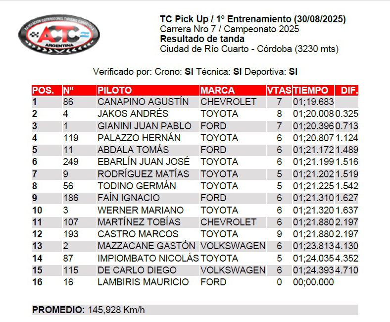 Con 14° de temperatura y abundante lluvia comenzó la actividad del TC Pick Up en el Autódromo “Ciudad de Río Cuarto”, donde Agustín Canapino con la Chevrolet S10 dominó el primer entrenamiento marcando 1’19”683/1000 para la mejor de de las 7 vueltas dadas.