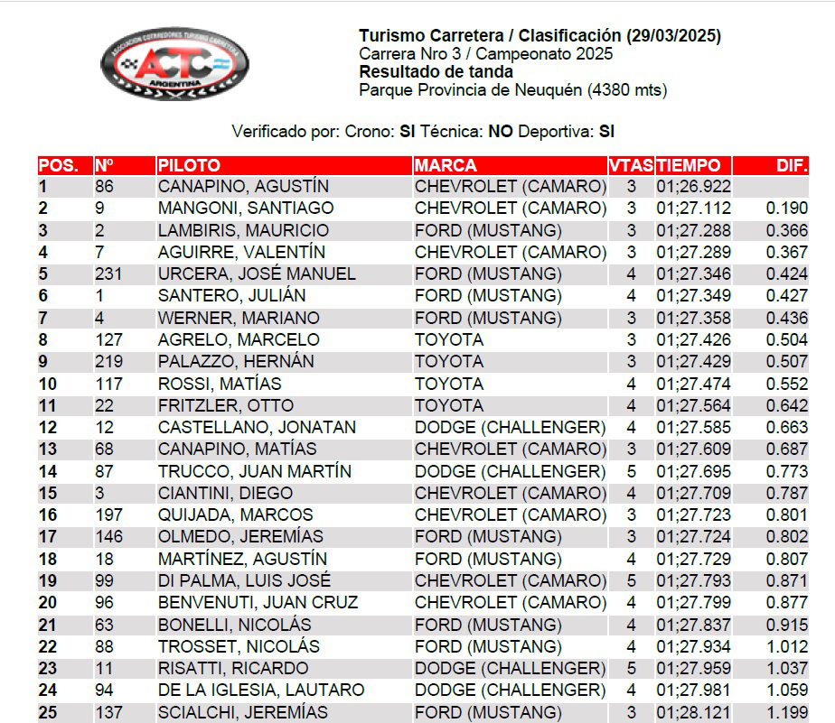 En la tercera clasificación de la temporada, la última presentación de la “Categoría de la Patria” en la Patagonia, los cordobeses Facundo Chapur/Torino y Ricardo Risatti/Dodge Challenger, ocuparon el 23° y 42° lugar respectivamente.