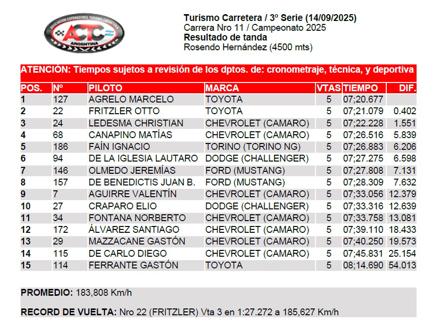 En la tercera de las series, sobresalió Marcelo Agrelo con el Toyota Camry ganando en 7'20"677/1000, siendo este parcial el mas lento de la mañana, lo cual llevará al piloto de Chubut a partir desde la segunda fila de la final, detrás de Canapino. En este parcial arribó escolta Otto Fritzler (Toyota Camry). A las 13:30 se largará la final a 25 vueltas o 50' de duración.