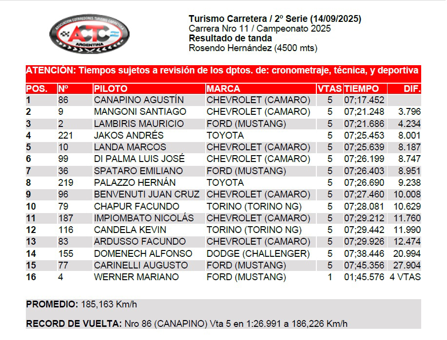 Agustín Canapino con el Chevroet Camaro #86 del "Canning Motorsport" arrasó en la segunda serie para convertirla en la mas rápida (7'17"452/1000) de la mañana del domingo en el Autódromo "Rosendo Hernández" de la capital puntana. En este parcial abandonó Mariano Werner (Ford Mustang) por rotura de motor cuando era escolta. Arribó segundo Santiago Mangoni (Chevrolet Camaro)