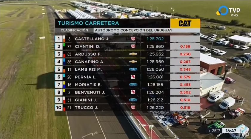 El líder del campeonato Agustín Canapino (Chevrolet) fue cuarto a 267/1000, mientras que el campeón Mariano Werner (Ford) quién ganó la fecha pasada, quedó en la 14° posición a 712/1000.