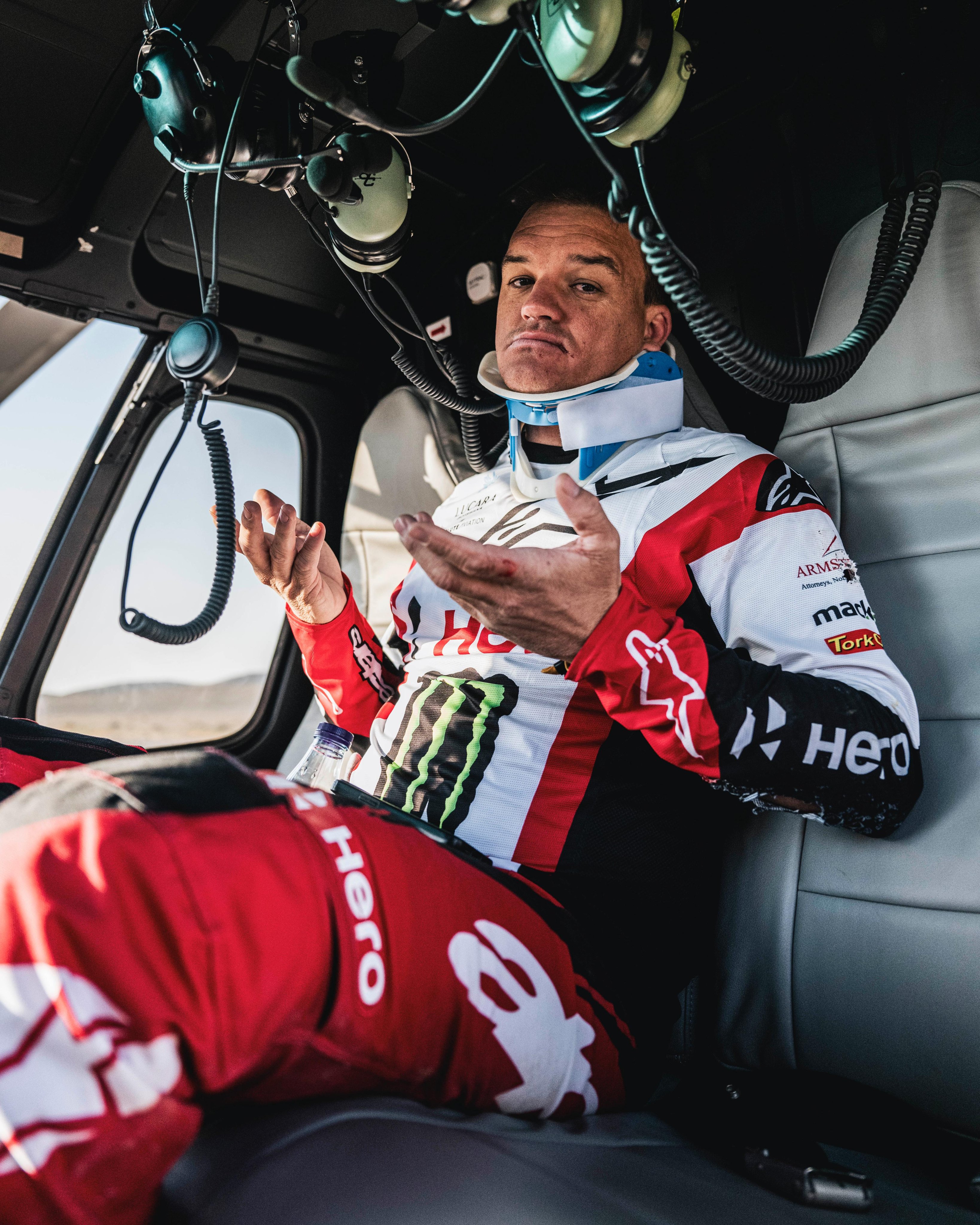 El parcial se abrió con la caída del campeón del mundo de Hero, el botsuano Ross Branch, que voló de su motocicleta en el KM48 y sufrió un aparatoso revolcón, en el que se golpeó el hombro izquierdo y la cabeza. Al -hasta hoy- tercero de la general, lo evacuó el helicóptero médico, al que accedió caminando por sus propios medios y solo se encuentra en observación debido al traumatismo de cráneo.